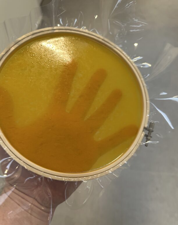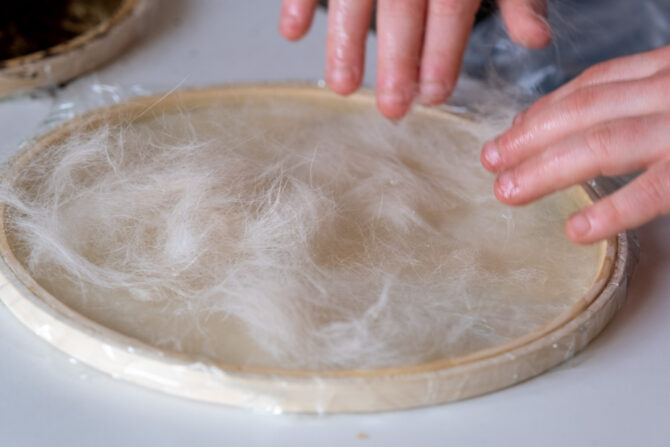 Når bioplast tørrer, krymper det, fordi vandet fordamper. Mindre glycerin betyder mere krympning. Hvis materialet stadig føles koldt, er det ikke helt tørt. Tykke lag kan mugne, så dæk det gerne til med stof, mens det tørrer.