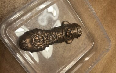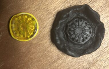 I dette kapitel ser vi på processen med at lave enkle forme i biomaterialer. Enkle forme lan laves, når det objekt, der skal afstøbes har en flad side, og når denne side er større end resten af objektet, da det ellers vil være svært at få ud af formen uden at ødelægge det. Det er måske et fysisk objekt, der allerede findes, eller måske er det bare en idé. Hvis det er det sidste, er eleverne nødt til at starte med at lave objektet. Det kan de gøre i ler, voks, 3D print eller på anden vis. Når objektet findes fysisk, skal eleverne lægge det ned i en ramme, som har sider, der er højere end objektet. Objektet skal fastklæbes, da det ellers vil flytte sig, når det overhældes med biomateriale. Se billede 2-5. Her er der fundet forskellige forme at lægge objektet i, bortset fra billede 5, hvor der er lavet et aftryk af objektet i voks og modelleret en side op omkring aftrykket. Når de forskellige eksempler overhældes med biomaterialer, vil det blive til støbeforme, som eleverne kan bruge til at genskabe objektet efterfølgende.