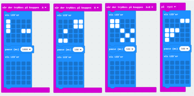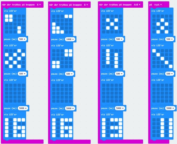 På nedenstående forslag er lagt andre antal ind. Disse antal vises når man trykker på B – eller A og B – eller ryster Micro:bitten.