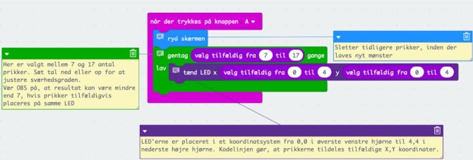 Du kan også lave programmet om, så det hver gang viser et tilfældigt antal hver gang. En måde at gøre det på ses nedenfor. Læg mærke til, at LED-skærmen først ryddes, når programmet startes igen ved tryk på A – den, som holder micro:bitten må bestemme, hvor længe billedet skal vises ved at holde den frem og fjerne den igen. Det skyldes, at man ellers ikke vil kunne tjekke, hvor mange LED-lamper, der egentlig lyser, hvis skærmen ryddes.