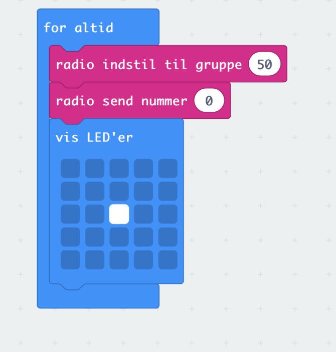 Sender-Micro:bitten (Den Micro:bit der skal gemmes) skal bruge koden herunder. Eller du kan klikke på linket, klik rediger og hent koden ned på Micro:bitten.