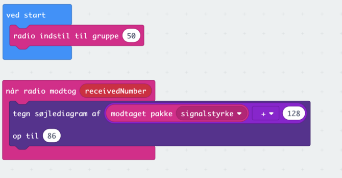 Man skal minimum bruge 2o Micro:bits. En skal gemmes og de andre skal finde den Micro:bit der er gemt. Med denne kode bliver der vist et søjlediagram på den Micro:bit der skal finde den gemte Micro:bit – jo tættere Micro:bitsene er på hinanden des højere er søjlen i søjlediagrammet. Man kan sagtens gemme flere Micro:bits Man gemme flere med forskellige radiogrupper eller bare en enkelt og sige til eleverne at radiogruppen er et sted mellem f.eks. 1 og 10. – Der er mange variationer