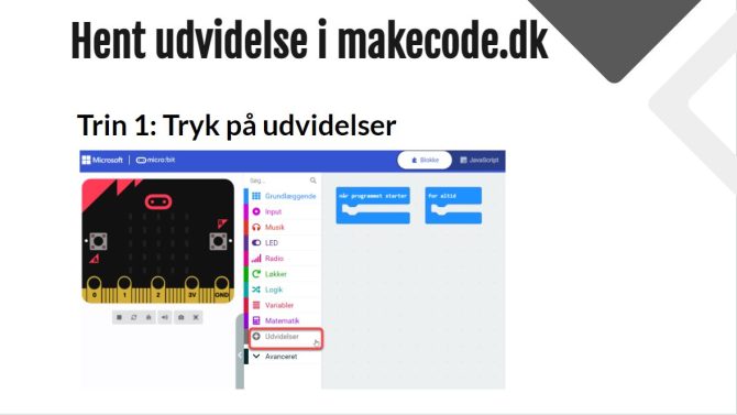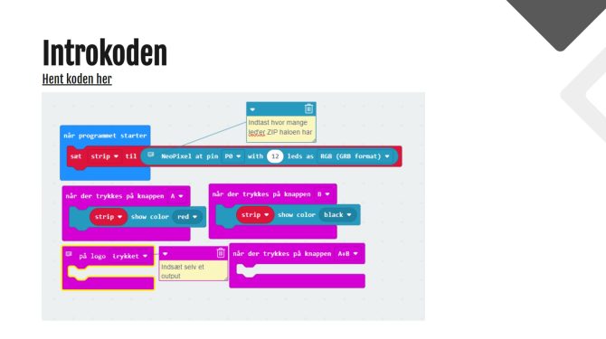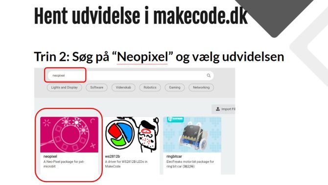 Den kodes i Makecode ved hjælp af udvidelsen “neopixel”.